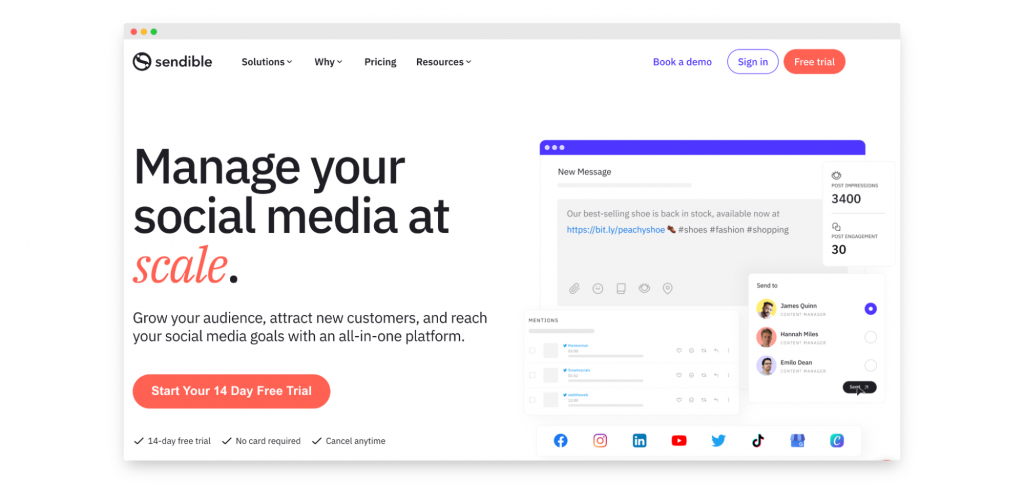 Quite a few social media management tools exist to help businesses with their presence on various platforms. Sendible is a tool that helps you measure your performance and track your goals, as well as allowing for team collaboration to make sure everyone is on the same page.
