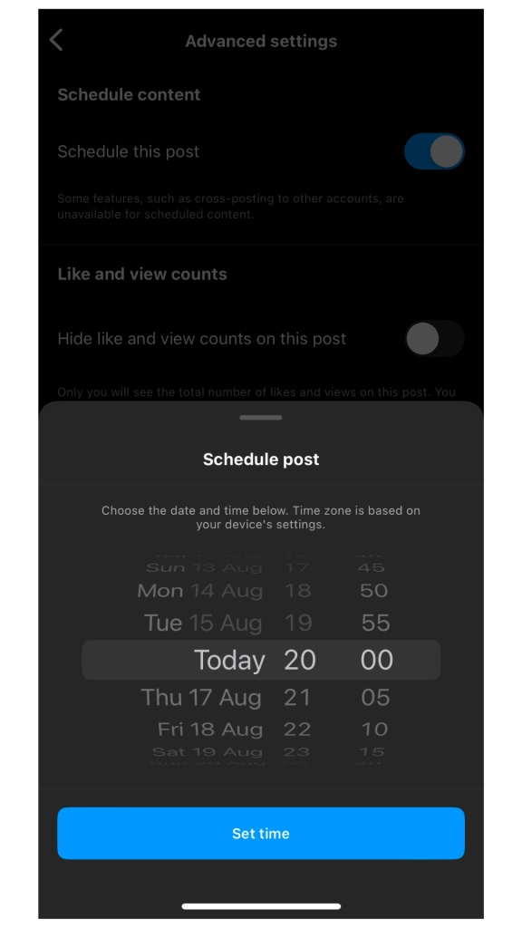 Once all of the creative elements are added, you can proceed to scheduling details. Choose a time and date for your Instagram post to go live.