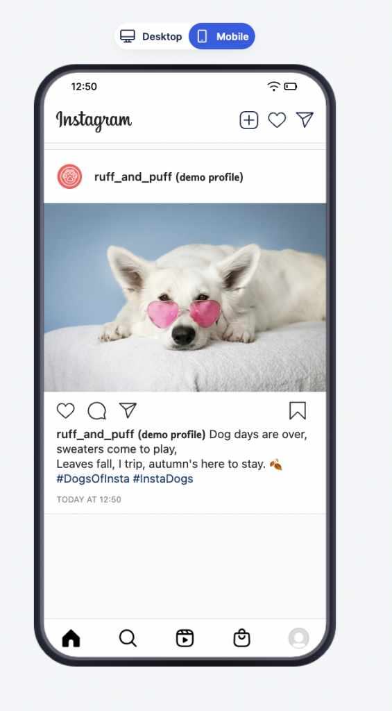 You might want to preview your post before you publish it. This is the option that native Instagram publishing does not offer. Once you click “Save”, you can preview how your post will look on desktop and mobile.