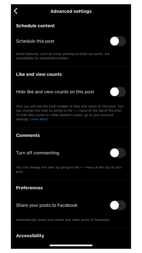 When done, tap Advanced Settings to proceed with Instagram scheduling. There are a lot of options there, with the first being “Schedule this post”.