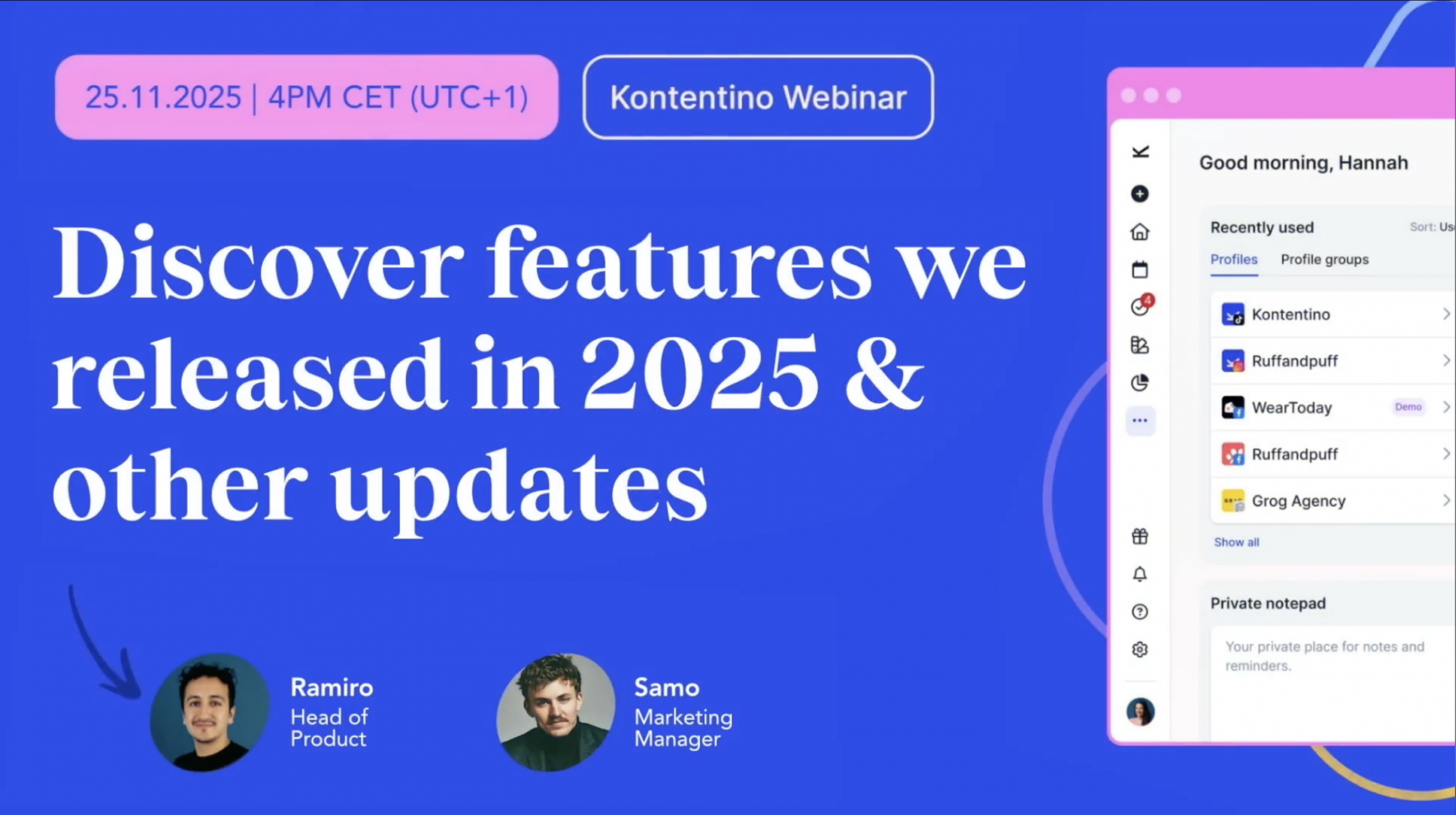 Aasta lõpu lähenedes toome teieni kiire kokkuvõtte novembrikuu uuendustest Kontentinos – rida täiendusi, mis muudavad sinu workflow selgemaks, kiiremaks ja paindlikumaks. Selles postituses räägime toote-webinari kokkuvõttest, uuest kinnituste jaoturist, nutikamast Instagrami postitamisest ja mitmekeelsest kasutajaliidesest. Vaatame lähemalt, mis on uut 👇