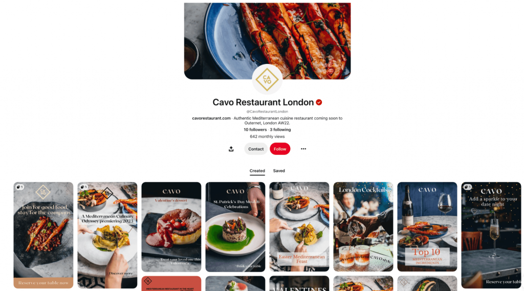 Bár nem olyan népszerű, mint a többi oldal, a Pinterest még mindig jó platform az étlap elemeinek és receptjeinek bemutatására. Különösen hasznos, ha sok szezonális ajánlatod van, amit szeretnél kiemelni.