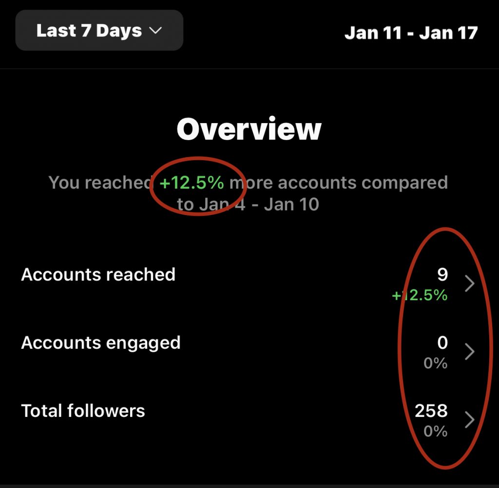 Pēc 7 dienām tu redzi, ka esi iesaistījis 250 kontus, tev ir 300 sekotāji un esi sasniedzis 1700 unikālo kontu.