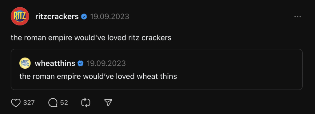 Napríklad značka Ritz Crackers využila internetový trend „Roman Empire“, aby získala viac pozornosti a reakcií pre svoju značku.